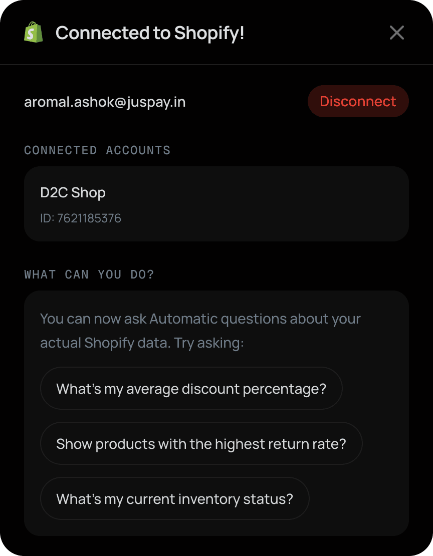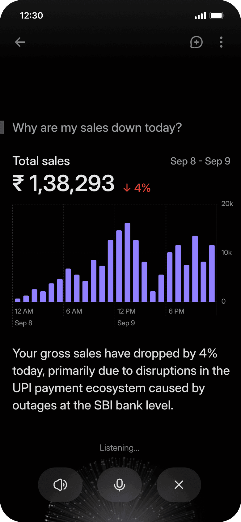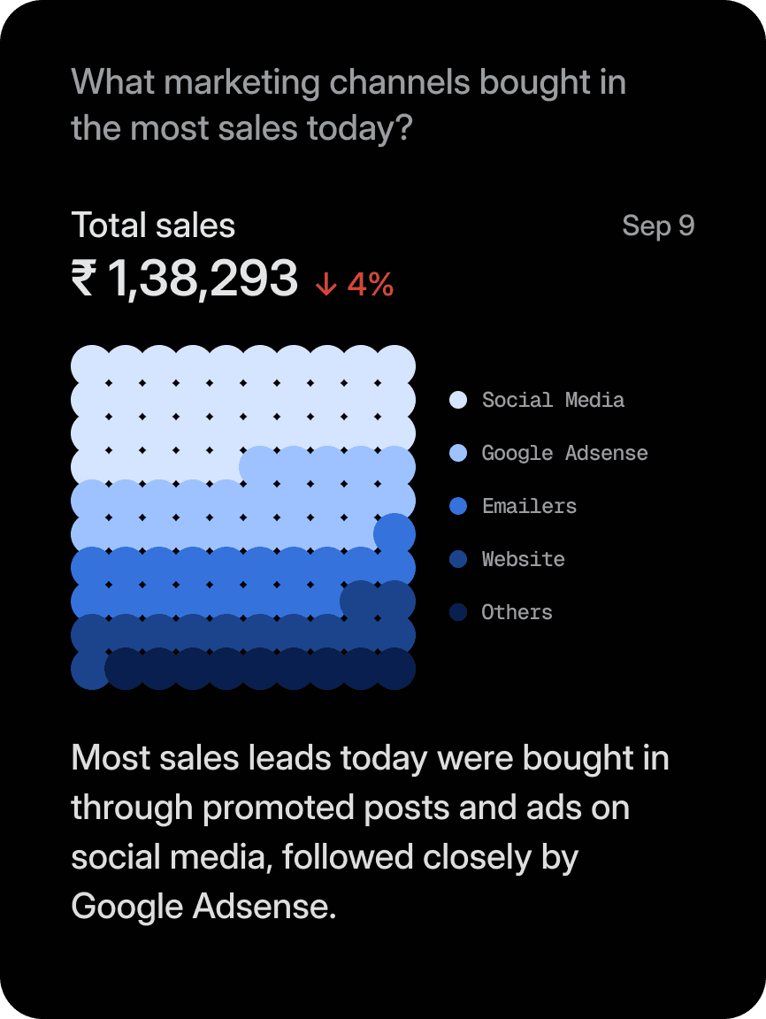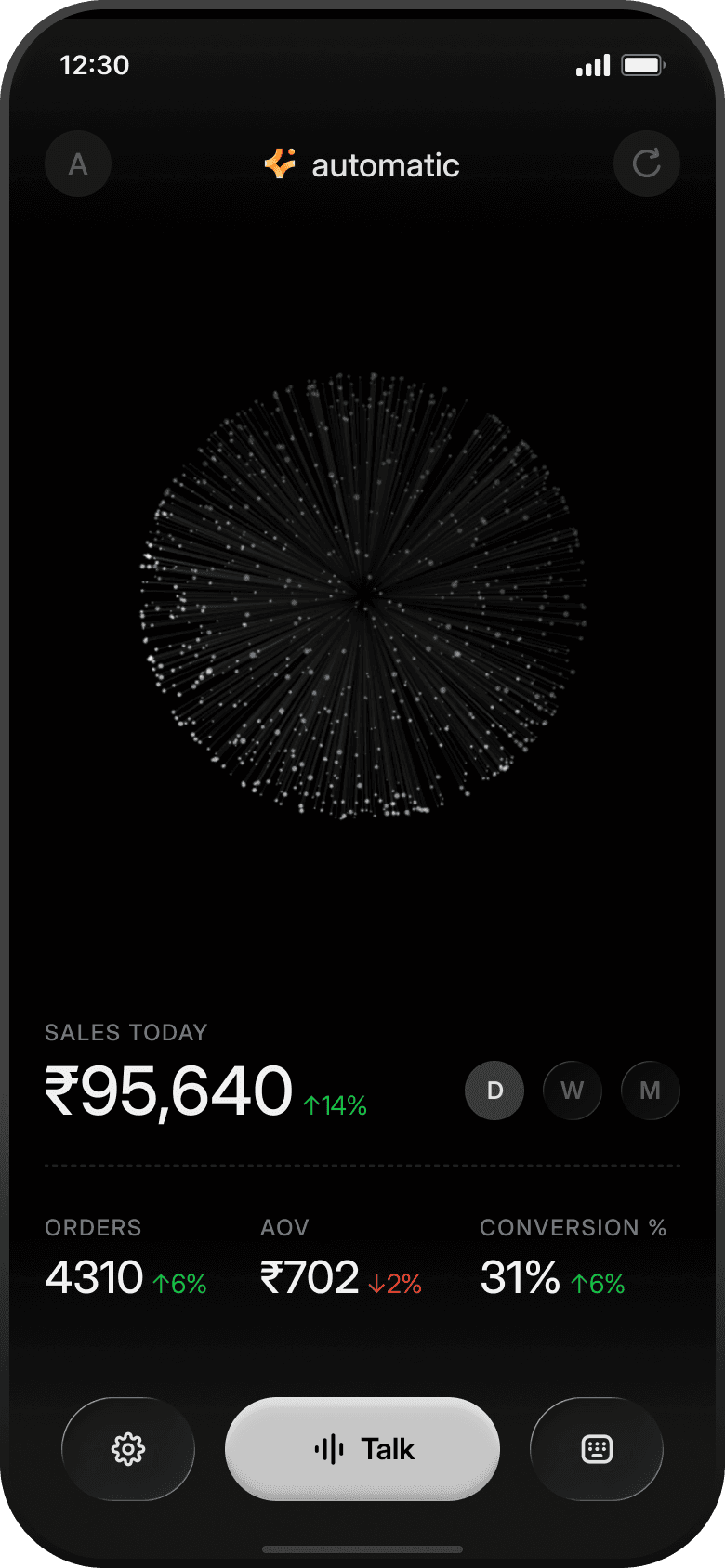 For D2C founders using Breeze’s e-commerce and plugin ecosystem, I designed an AI Assistant that connects to their actual data sources (Shopify, Juspay, Meta Ads, Google Analytics and more) in real-time and surfaces relevant insights while suggesting impactful actions that can be taken directly at the push of a button.