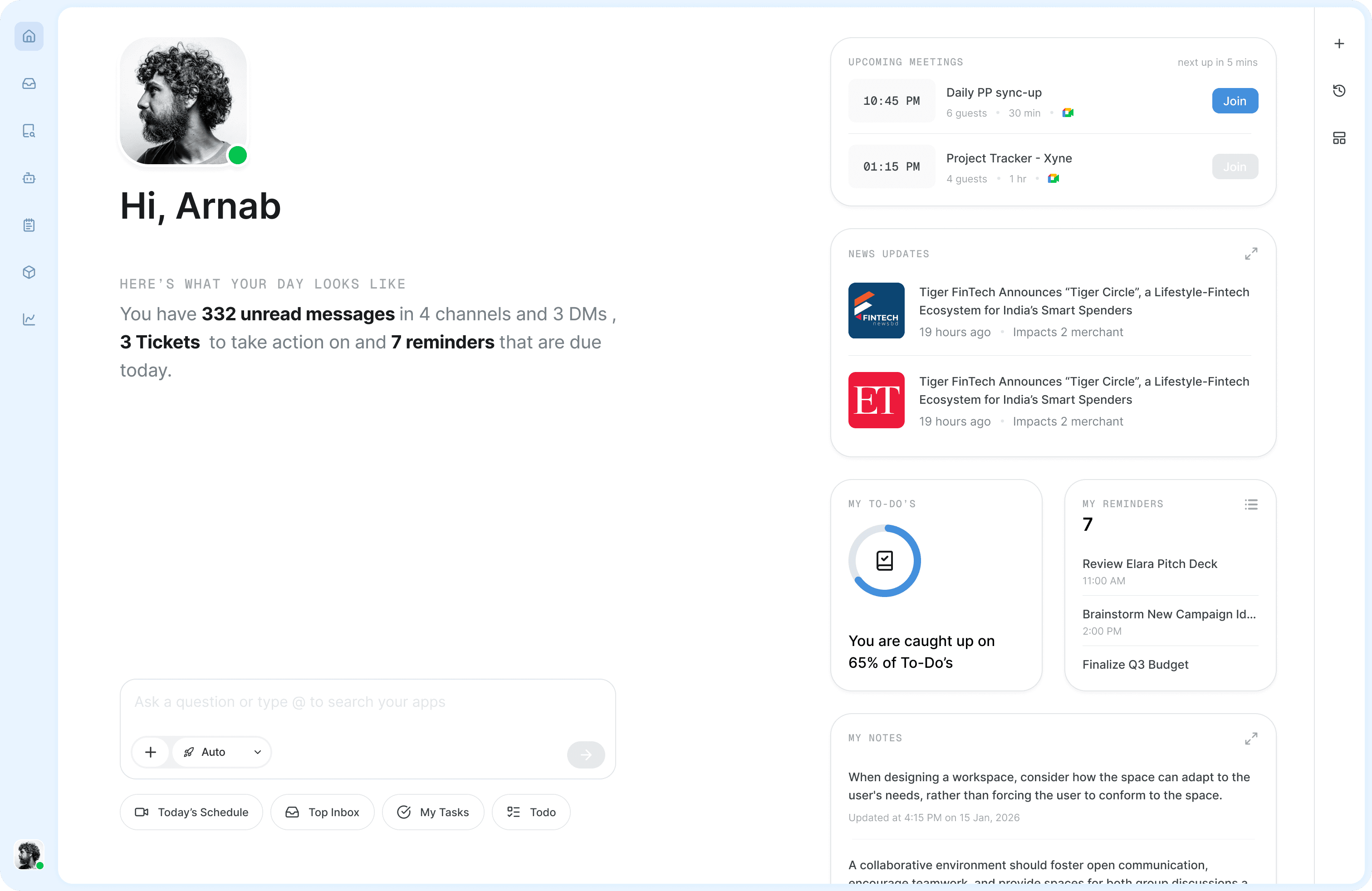 Tired of segregated communication and task management tools, at Juspay we decided to build our own in house AI powered collaboration tool that allows users to 10x their productivity by bringing Slack, Jira, Notion & Chrome, all into a neat symbiotic package.